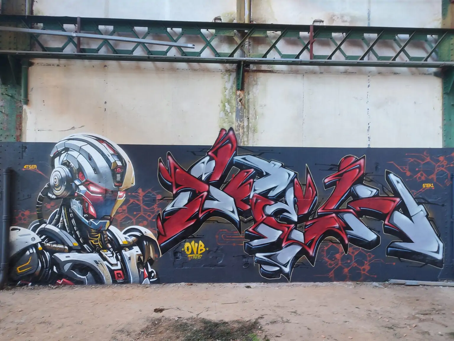 De l’autre côtés, Stek insuffle l’énergie brute du graffiti avec un lettrage sauvage et acéré. Les formes anguleuses, les teintes métalliques et rouge vif, et les flèches dynamiques semblent éclater hors du mur, comme une explosion d’énergie dans cet univers statique. Ce style affirmé, porte une dimension organique, presque vivante, qui dialogue avec la froideur robotique du sujet de 4tser. Les motifs en fond, semblables à des circuits imprimés, lient des deux vision dans une cohérence esthétique remarquable.