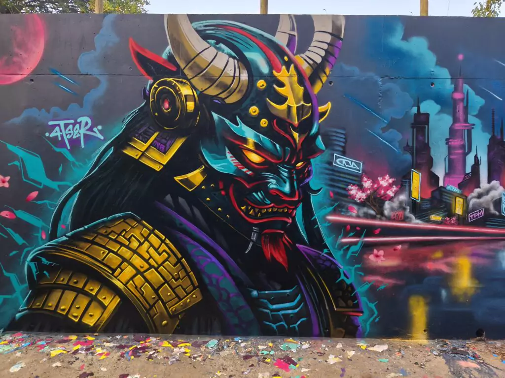 Entre tradition japonaise et univers digital, la fresque Cyber Samouraï mélange mythologie et néons.