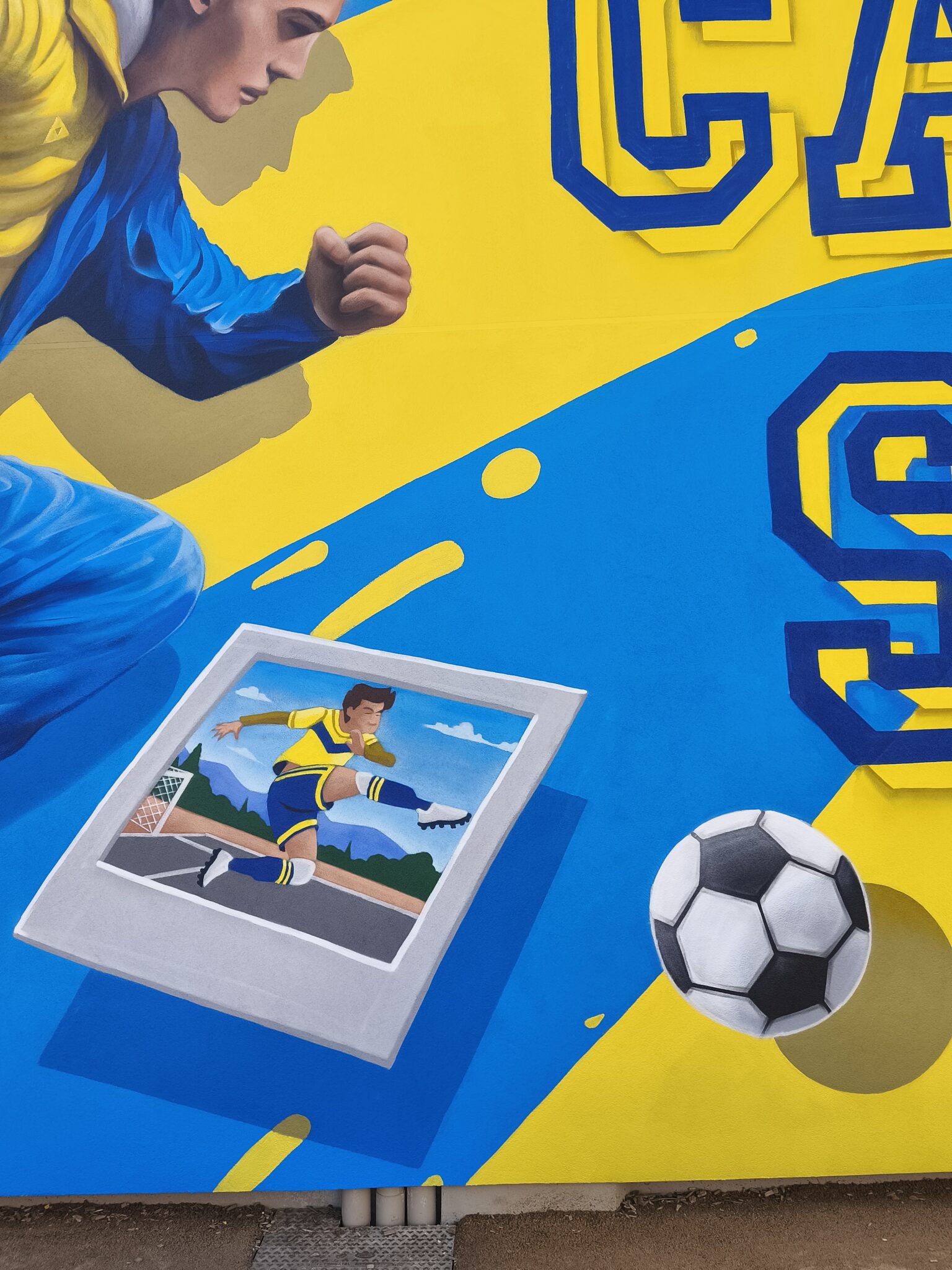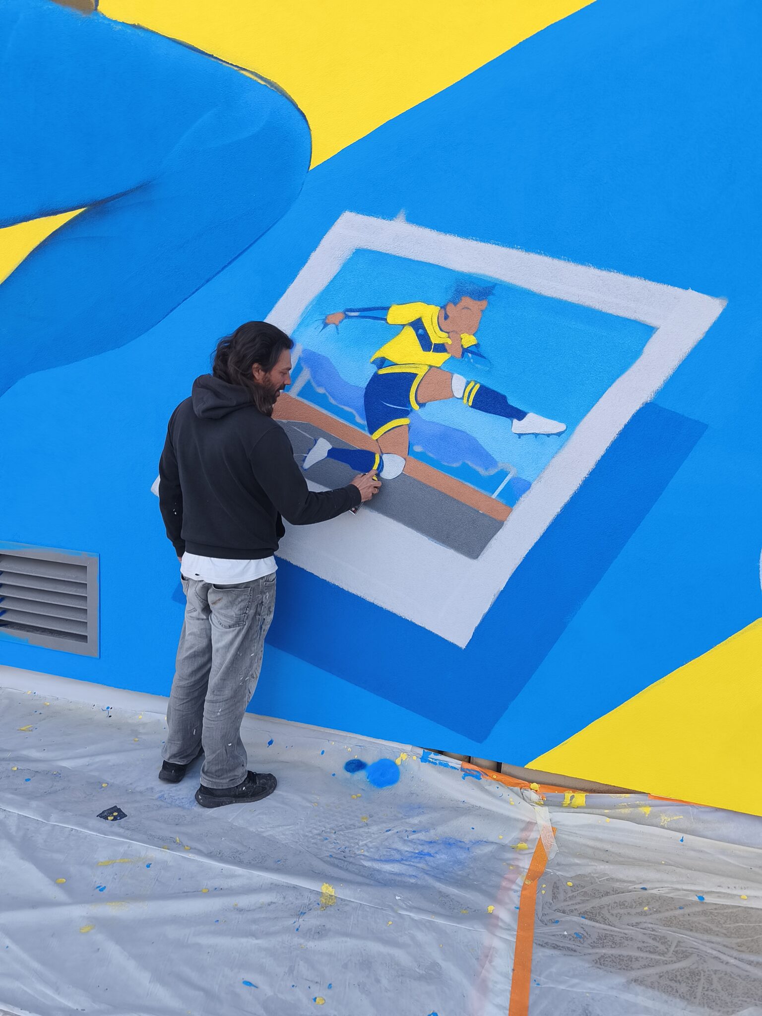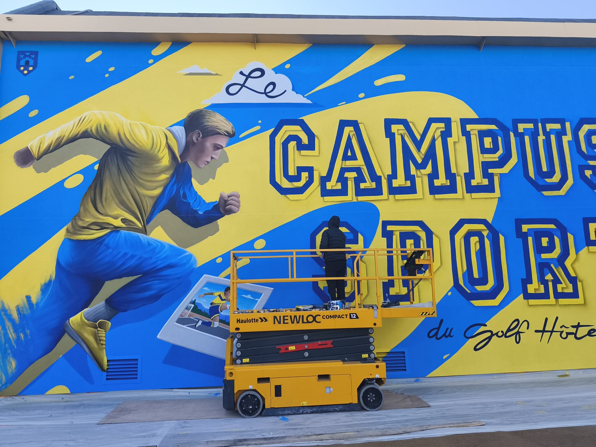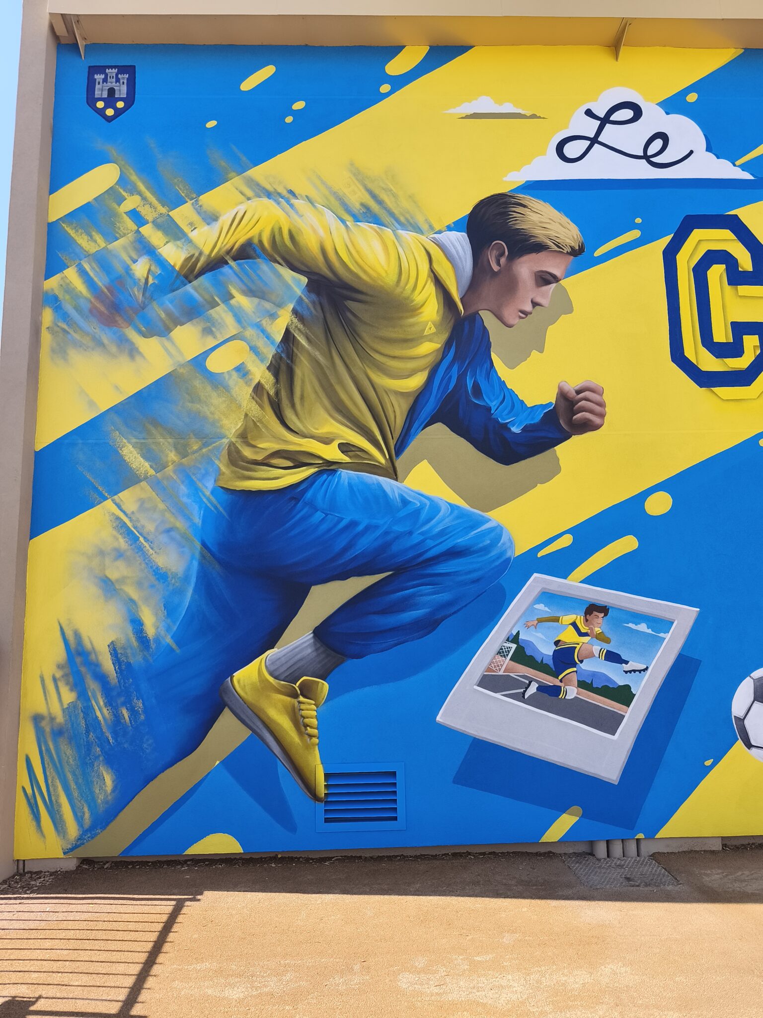 La composition repose sur un contraste puissant entre le bleu profond et le jaune lumineux, couleurs emblématiques qui évoquent à la fois la vitalité, le mouvement et l’esprit d’équipe. Au centre de la fresque, le lettrage “CAMPUS SPORTIF” s’impose avec force, traité dans un style inspiré des univers sportifs et universitaires. Il structure l’ensemble et donne immédiatement le ton : un lieu dédié à la performance, à la progression et au partage. À gauche, un athlète en pleine course incarne l’élan, la détermination et la vitesse. Le traitement du mouvement, avec ses effets de matière et de dispersion, renforce l’impression d’énergie en constante transformation.