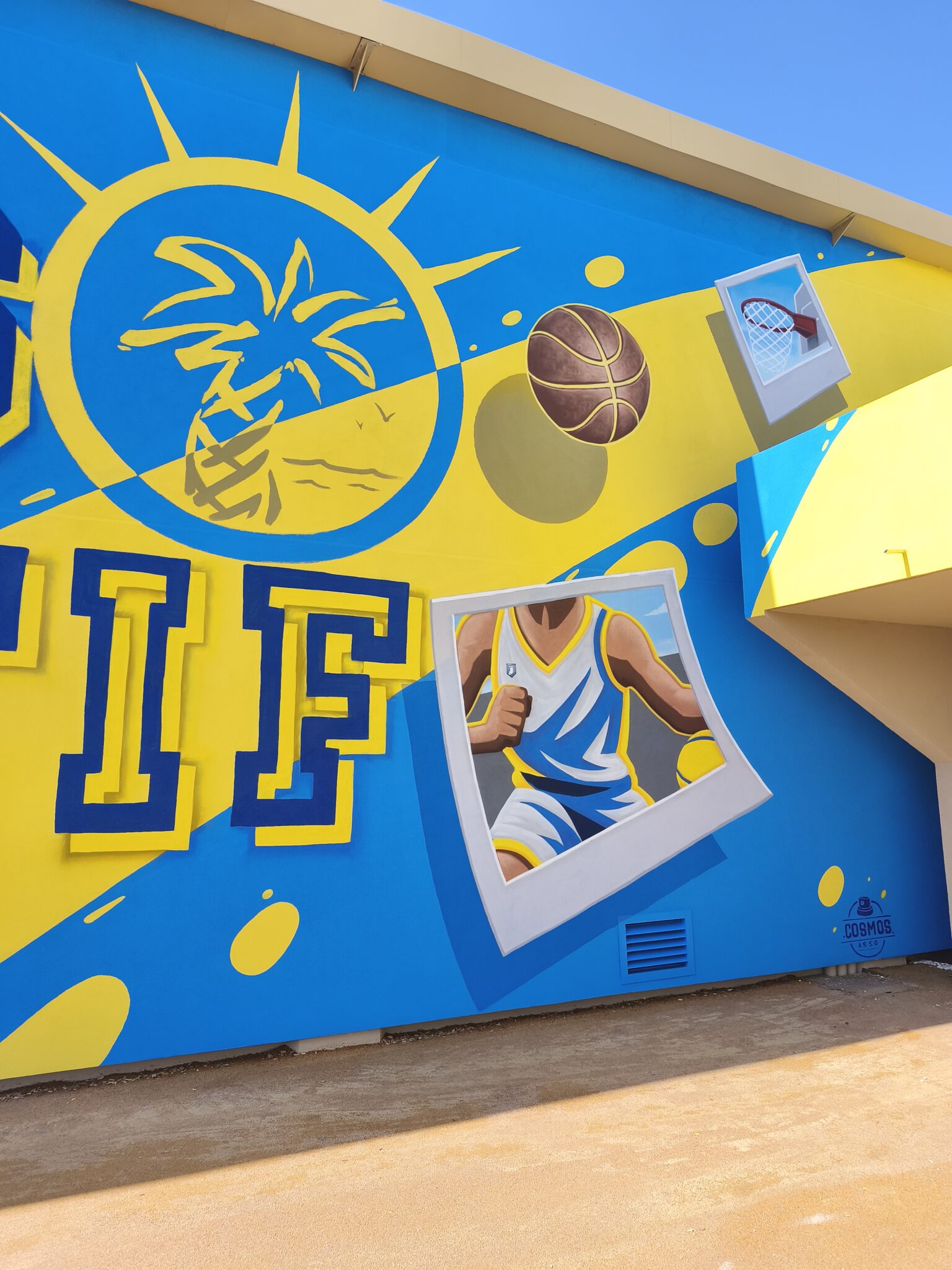 L’association COSMOS a récemment réalisé une fresque murale d’envergure sur la façade du nouveau complexe sportif du Golf Hôtel, baptisé “Campus Sportif”, au cœur de la ville de Hyères. Pensée comme une véritable signature visuelle, cette fresque ne se limite pas à un habillage esthétique. Elle participe pleinement à la valorisation du site en créant un repère visuel fort pour les usagers du complexe. Le projet s’inscrit dans une volonté de rendre l’art urbain accessible, positif et intégré à l’espace public, en lien direct avec les usages du lieu.