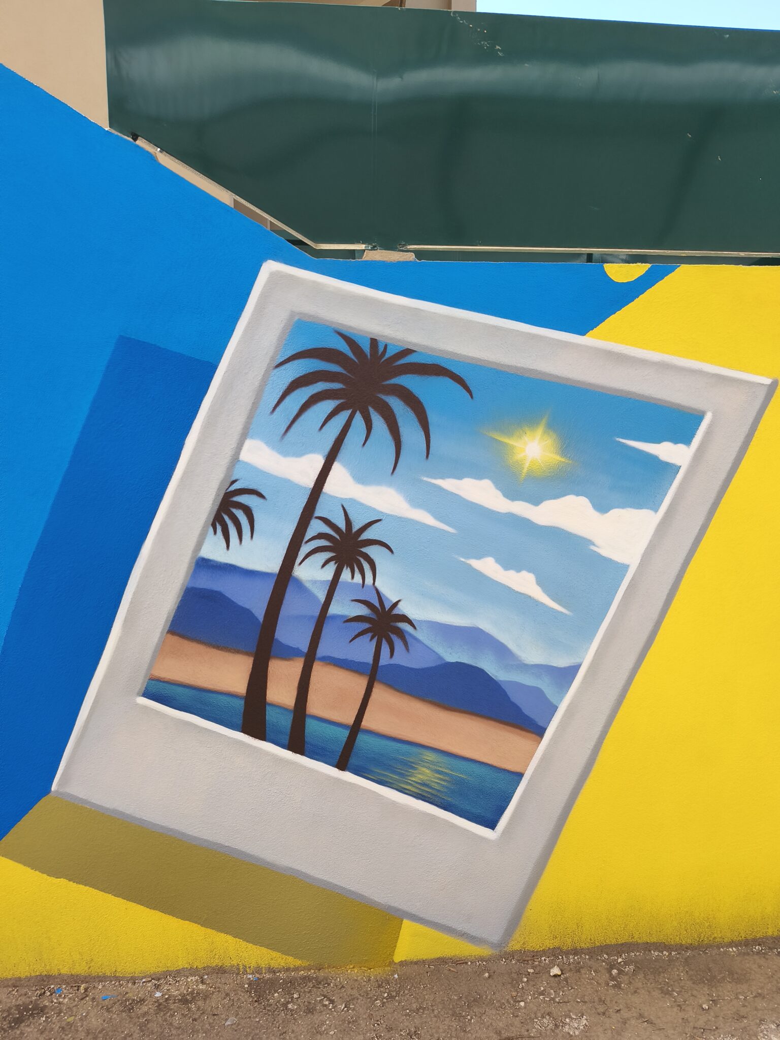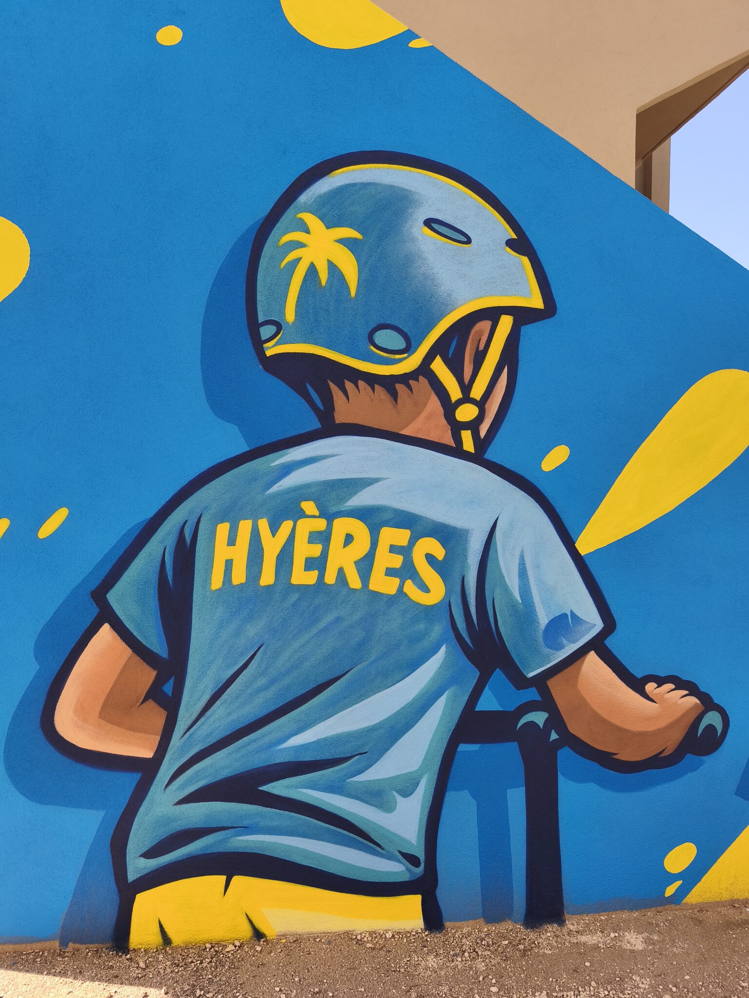 - des symboles locaux, comme le palmier stylisé, qui ancre la fresque dans l’identité hyéroise.